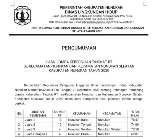 telah di terbitkan Keputusan BUPATI NUNUKAN Nomor 188.45/689/XII/2019 Tentang Penepatan Jenis Rencana Usaha dan/atau Kegiatan Wajib Memiliki Upaya Pengelolaan Lingkungan Hidup dan Upaya Pengelolaan...